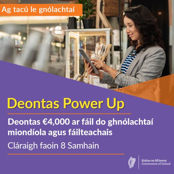 Deontas €4,000 ar fáil do ghnólachtaí miondíola agus fáilteachais. Cláraigh faoin 8 Samhain ag enterprise.gov.ie/powerup